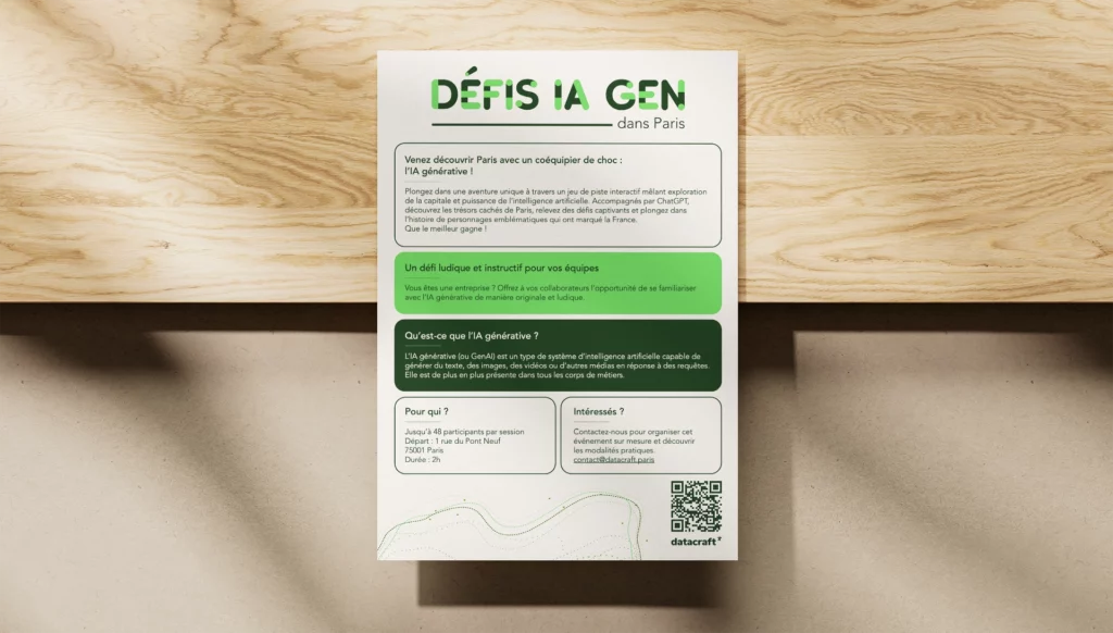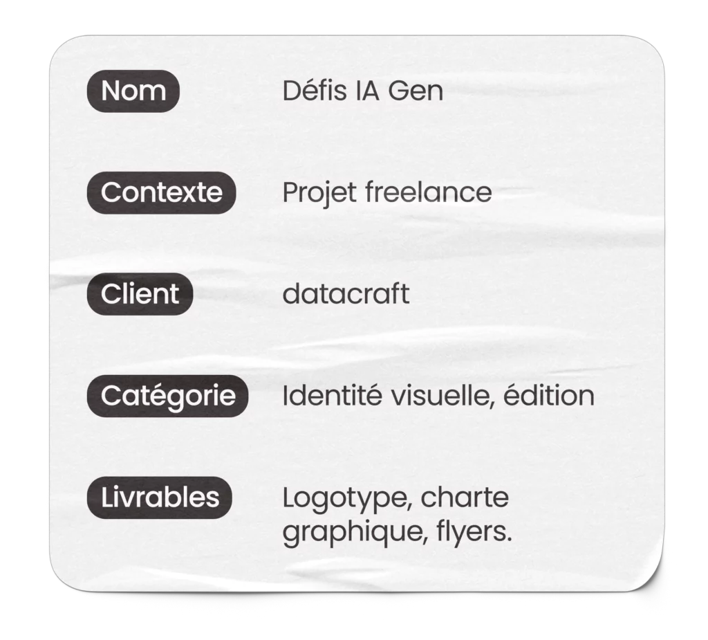 J’ai accompagné datacraft, une startup spécialisée en data science et intelligence artificielle, dans la conception de l’identité visuelle et de la communication de leur nouveau projet : Défis IA Gen.