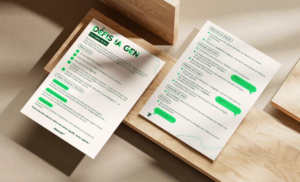 J’ai également réalisé deux supports imprimés : présentation et règles du jeu. La palette de couleurs reprend celle de datacraft, pour une cohérence visuelle avec l’identité de la marque.
